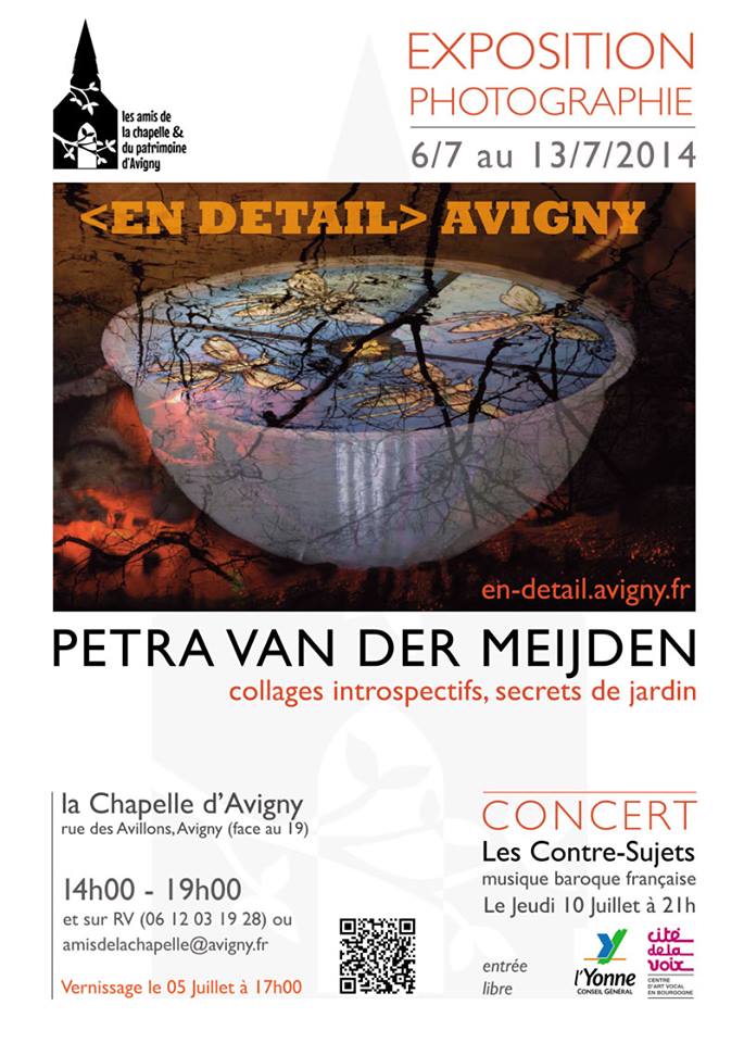 Du 6/7 au 13/7 2014 la Chapelle d’Avigny était ouverte à l’art contemporain avec un travail photographique mystérieux et poétique de Petra van der Meijden qui a exposé pour la première fois en France. Elle a conçu cette série d’œuvres sur place, dans le hameau d’Avigny. <en-détail> est une recherche sur la pertinence des détails, ces éléments minuscules qui composent notre monde. L’artiste étudie le micro monde qui l’entoure, en l’occurrence la nature d’Avigny, hameau en Bourgogne, France.